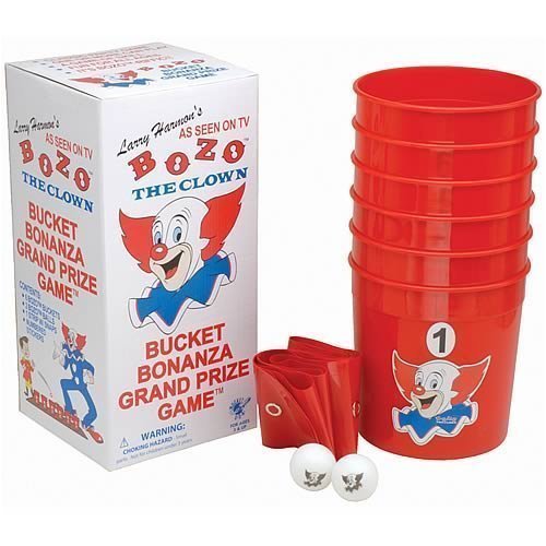Buy from Amazon.com One of my favorite parts of WGN-TV’s Bozo the Clown show was when Bob Bell, aka. Bozo the Clown, would do the Bozo Grand Prize Game. with a boy and a girl from the studio audience.  There would be six buckets in a row, and the contestant would throw a ping pong ball into the nearest bucket, and win a small prize.  They would attempt to throw the ping pong ball into the second bucket, and win a larger prize, and so on.  It’s much harder than it sounds, since the further the ping pong ball was tossed, the more difficult the toss – and the more likely it was to bounce out.