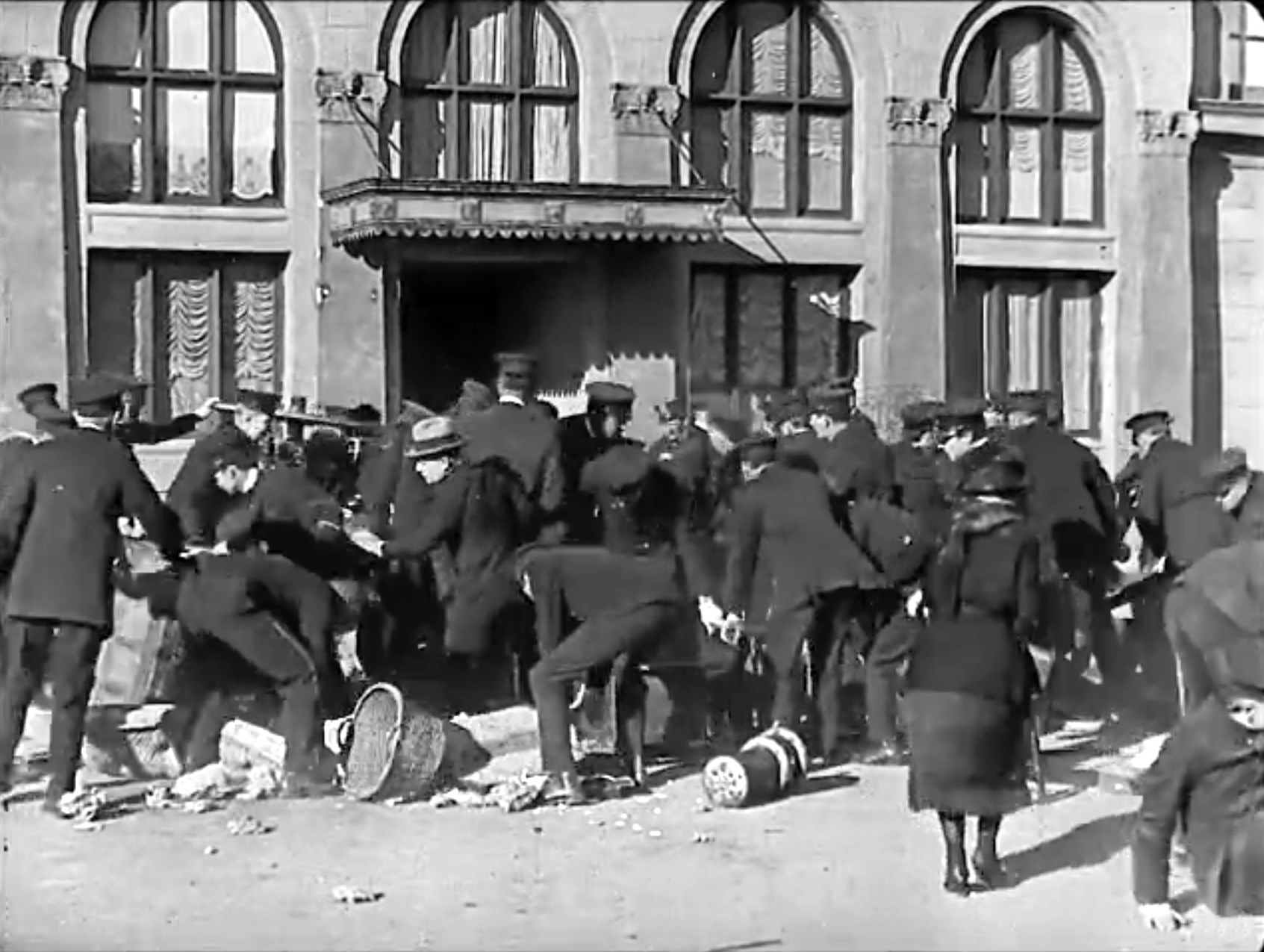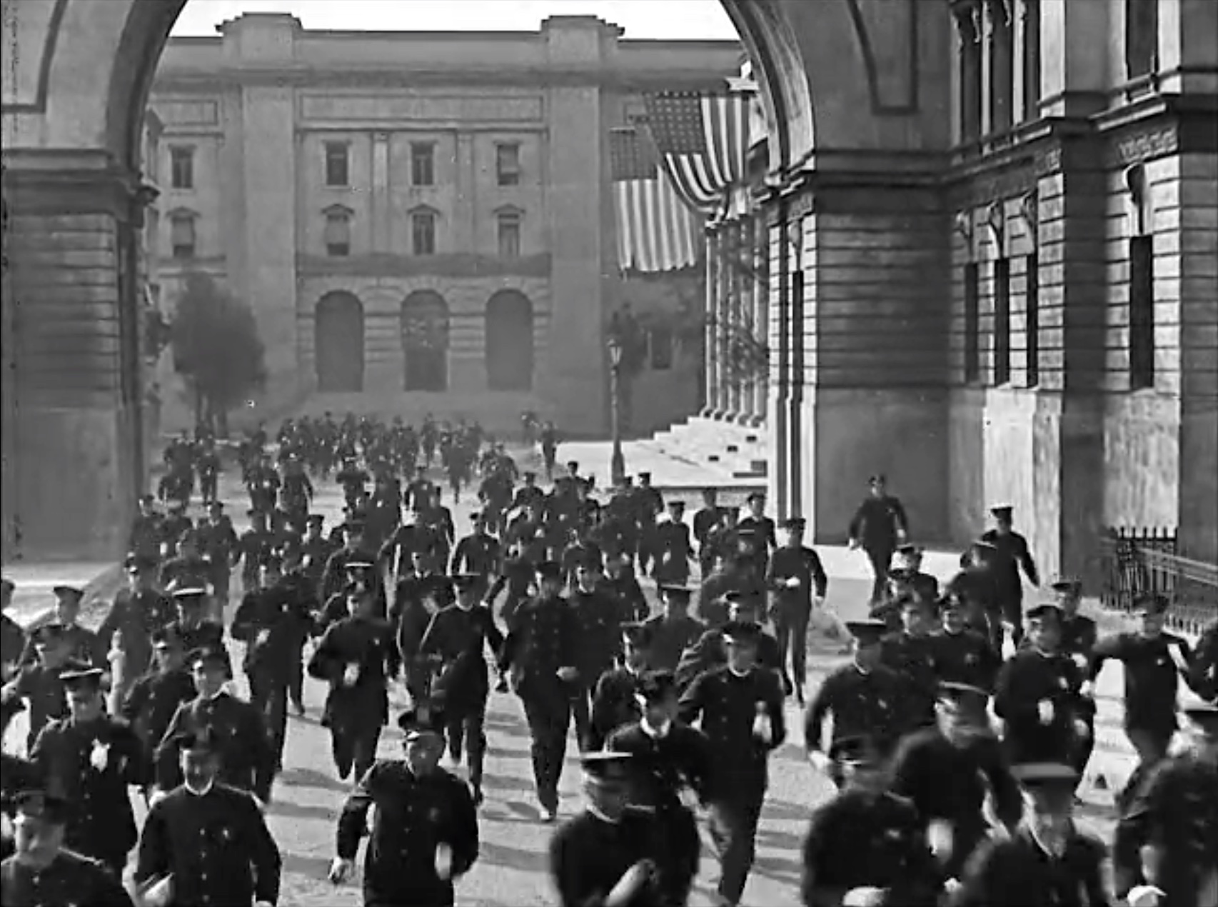 At the very end, a huge crowd of cops chase Buster Keaton into the police precinct. Somehow, Buster appropriates a policeman’s uniform, walks out, and locks the door behind him! He sees his girlfriend who … snubs him. Brokenhearted, Buster unlocks the precinct doors, walks into the mass of cops, ending the short.