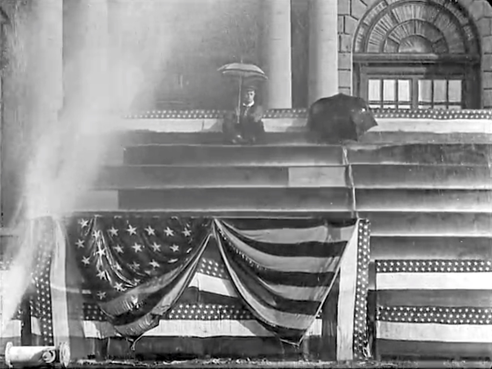 There’s wan annual police parade. And, the audience sees that Buster’s girlfriend is the Mayor’s daughter. And Buster mistakenly gets caught up in the parade! That’s funny enough, but then an anarchist throws a bomb on Buster. He throws its away — in the midst of the police! And the madcap chase is under way! The poor horse runs wildly, knocking over a fire hydrant! Hundreds of police officers are now chasing Buster. He keeps eluding capture in a variety of funny, clownish escapes. It’s madcap, and hilarious! And that homeowner, who’s been waiting for his furniture to arrive? He’s also a cop!