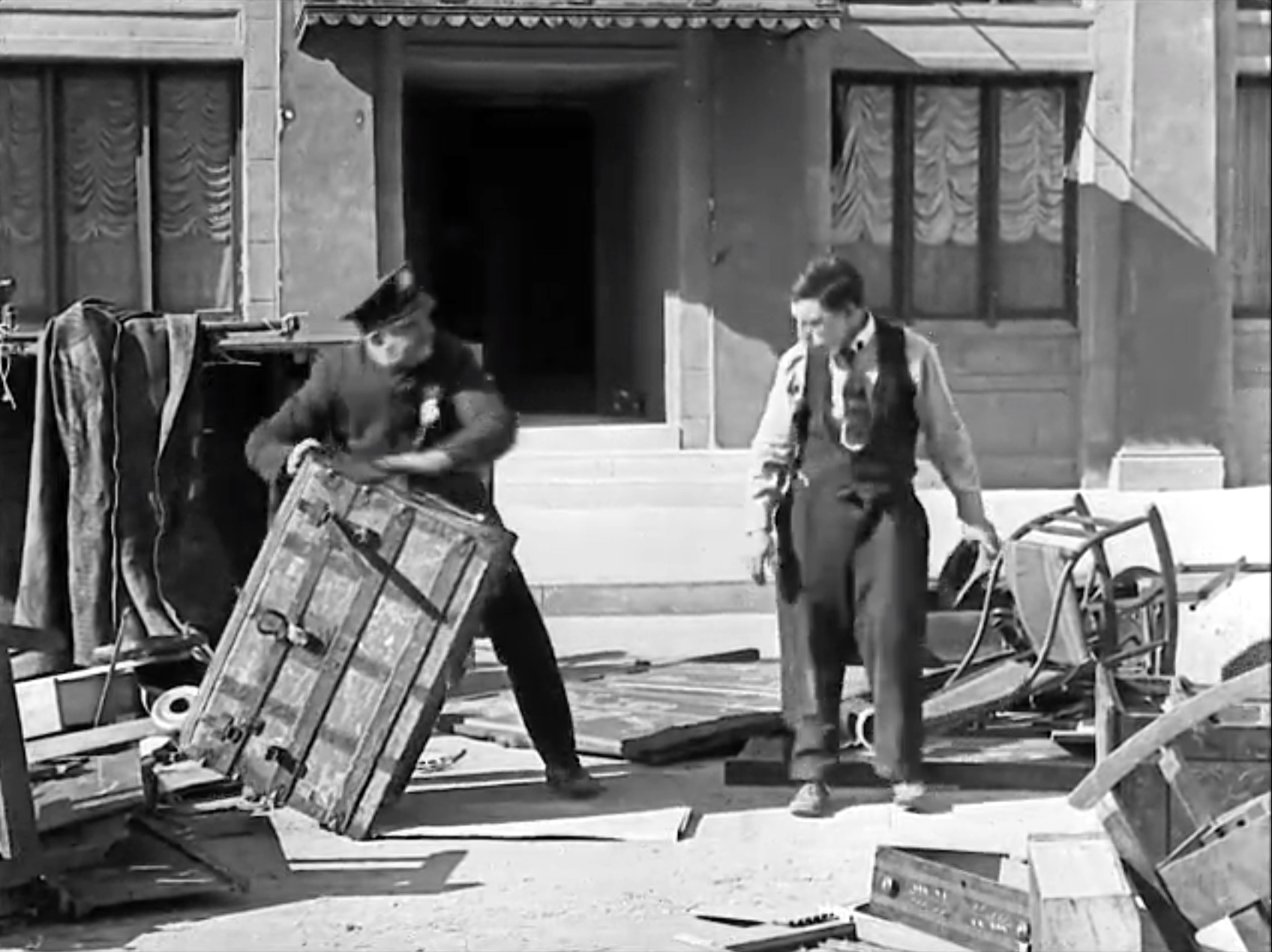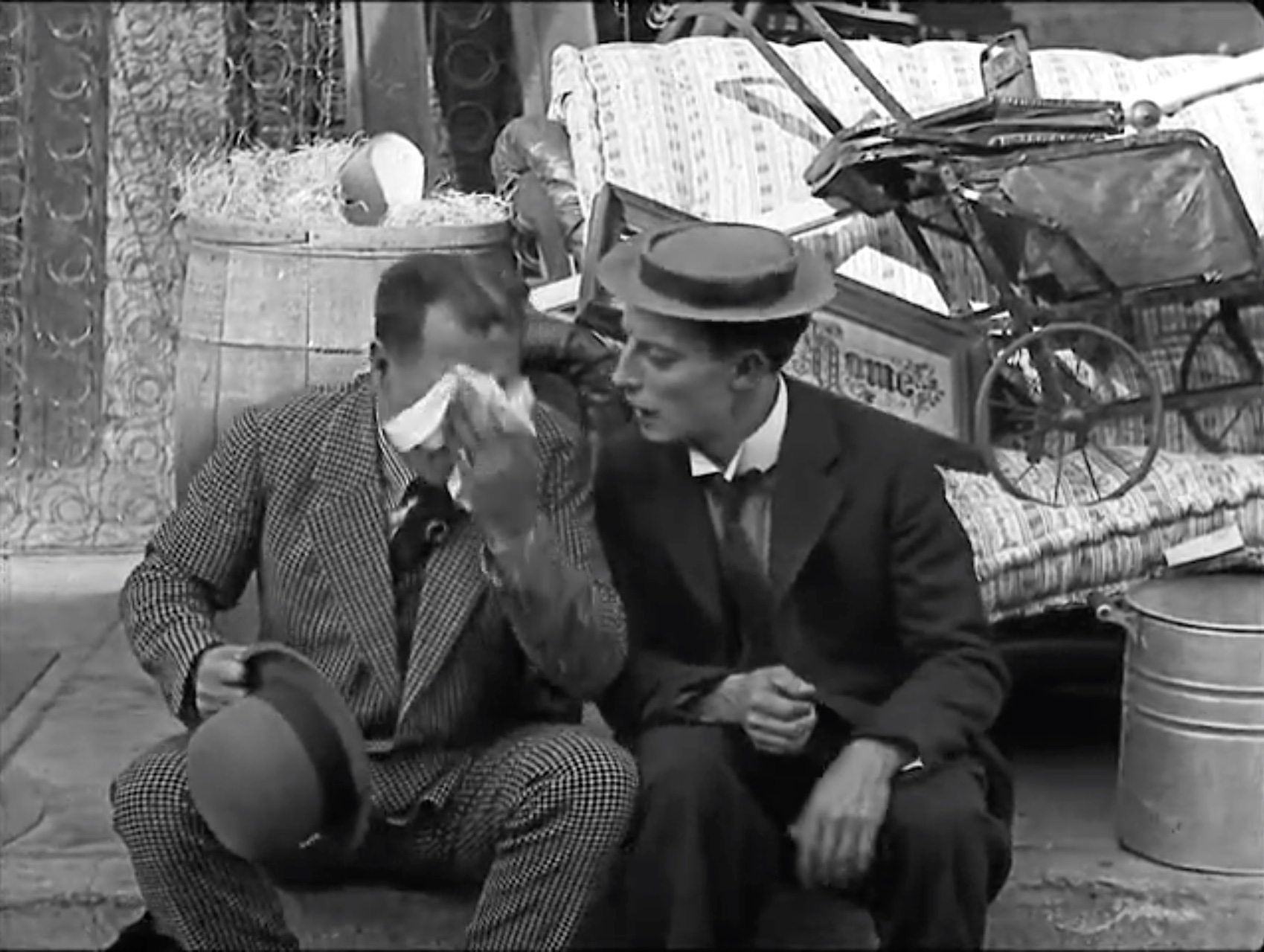 The actual owner of the furniture helps load the wagon, thinking that Buster’s the moving man he hired. It’s a very funny, slapstick affair. But eventually, Buster leaves with “his” furniture, horse, and wagon. When buster tries to signal for a turn, he gets bitten by a dog! So, in a moment of clown cleverness, he uses a telescoping piece for furniture and a boxing glove as a turn signal. Punching out a cop on the way!