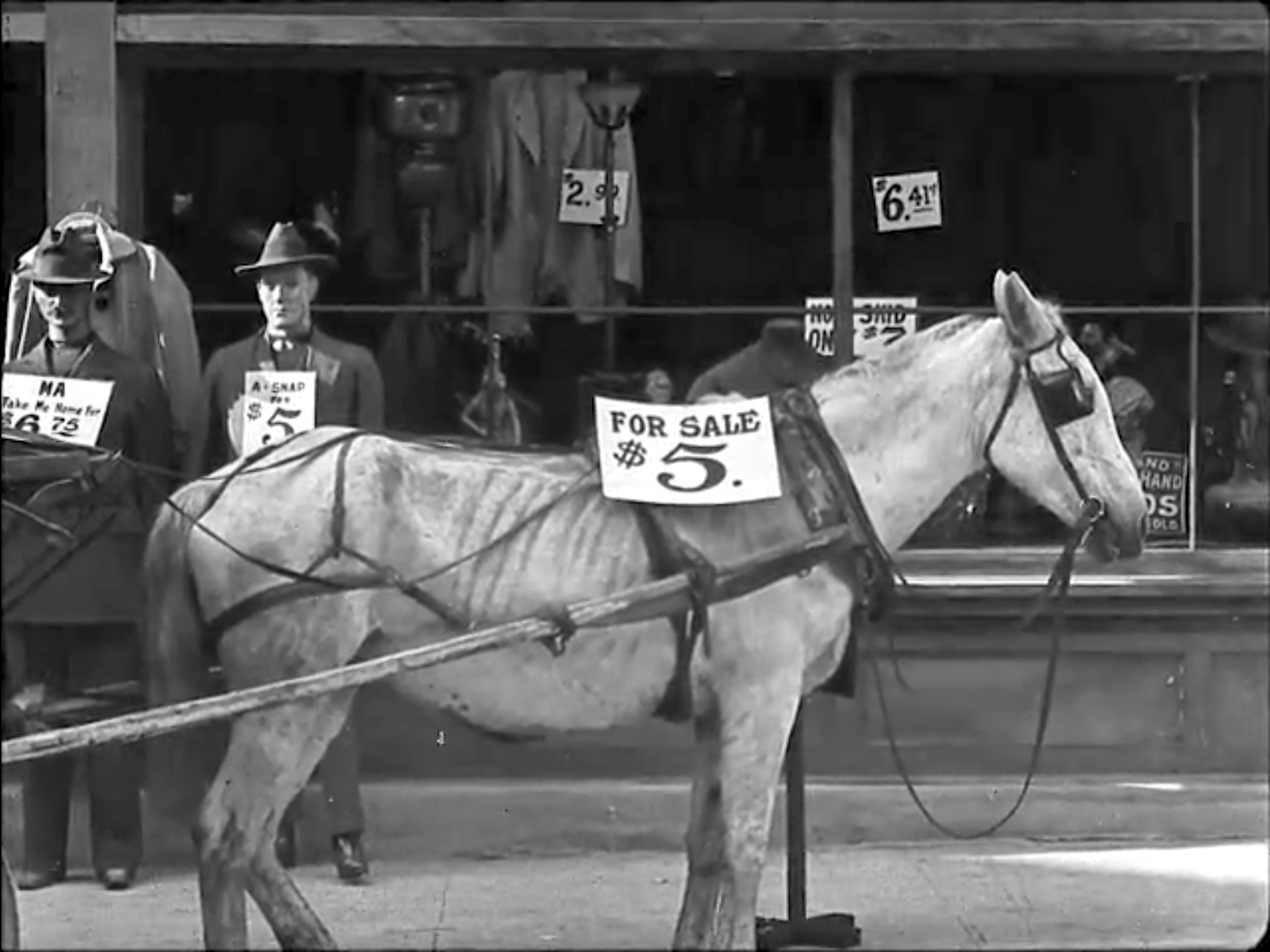 Now that Buster has money to invest, how to spend it wisely? A family is moving from an apartment to a house, and they’ve called for a mover. But, a con man, having seen Buster with the cash, fools him into “buying” the furniture, beds, etc. Buster’s planning on reselling “his” new furniture at a profit. But how to sell it? Across the street, he sees a horse and wagon for sale. For only $5.00! Of course, this is another misunderstanding, but Buster doesn’t realize it, and takes “his” horse and wagon to load up “his” furniture.