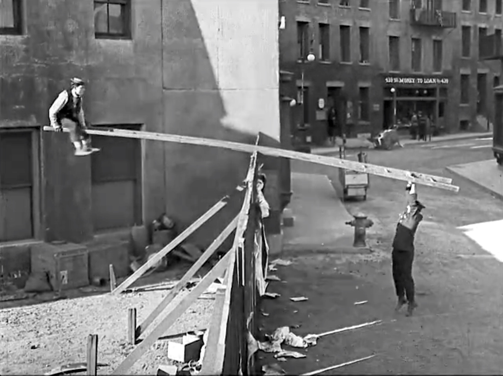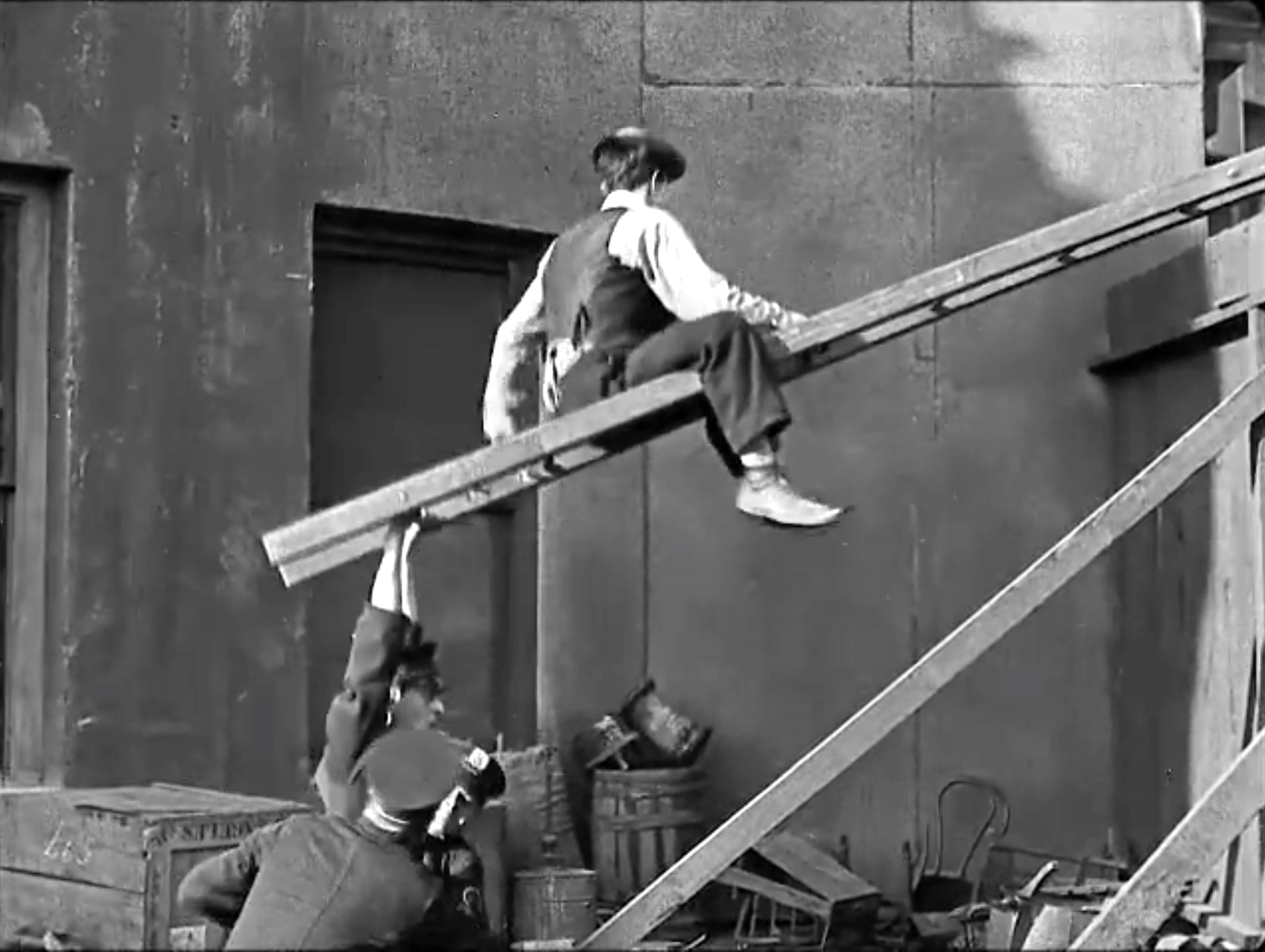 There’s far too much visual comedy to share here — the movie’s embedded at the bottom. But, I’m going to include my favorite: Buster is trying to escape over a fence, courtesy of a long ladder. It acts like a giant seesaw, with police on both ends of the ladder. It ends with him getting catapulted through the air!