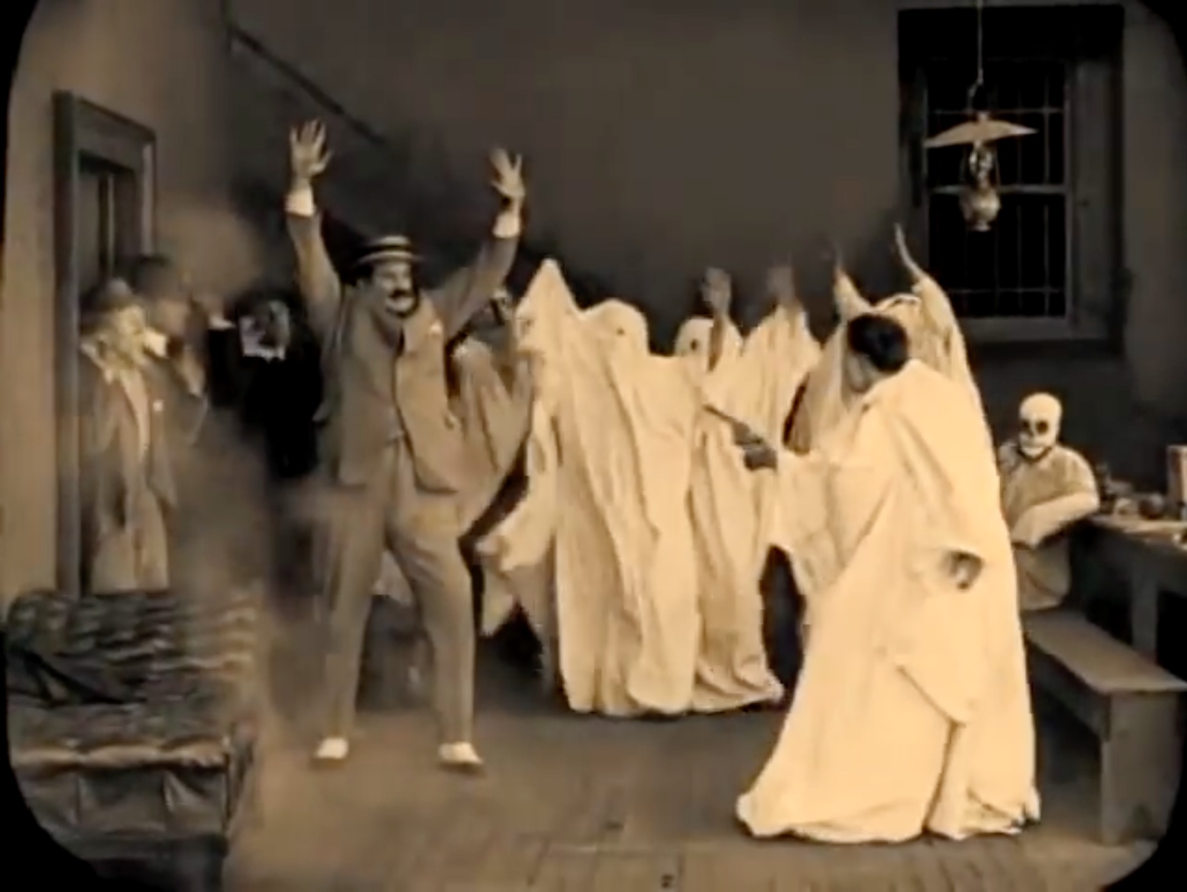 At the theater, there’s a play being put on – badly. So badly, that the actors are thrown off the stage — and the audience chases after them! Then run into the haunted house for safety. Where Buster has already went to hide. Soon, there’s oodles of prop comedy, with a collapsing staircase, “ghosts”, trapdoors, etc. The crooks are disguised a spooks, the actors are running all over, add there’s a great many things that have since become a staple of the haunted house. Except for the magic trick of two “skeletons” assembling a man from pieces, and he comes to life!