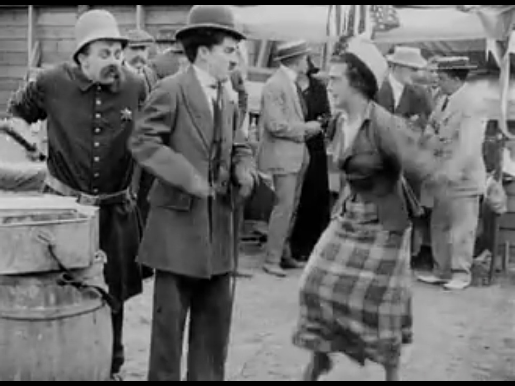 He tries to be ingratiating to a group of ladies, and does some nice comic moments. But the main conflict doesn’t happen until Mabel puts down her box of hot dogs. And Charlie picks it up to disguise himself while fleeing from a police officer. He (unintentionally) begins giving away free hot dogs, and soon there’s a fight between himself and Mabel. With Mabel realizing what a lousy day she’s having, and Charlie doing his best to comfort her.