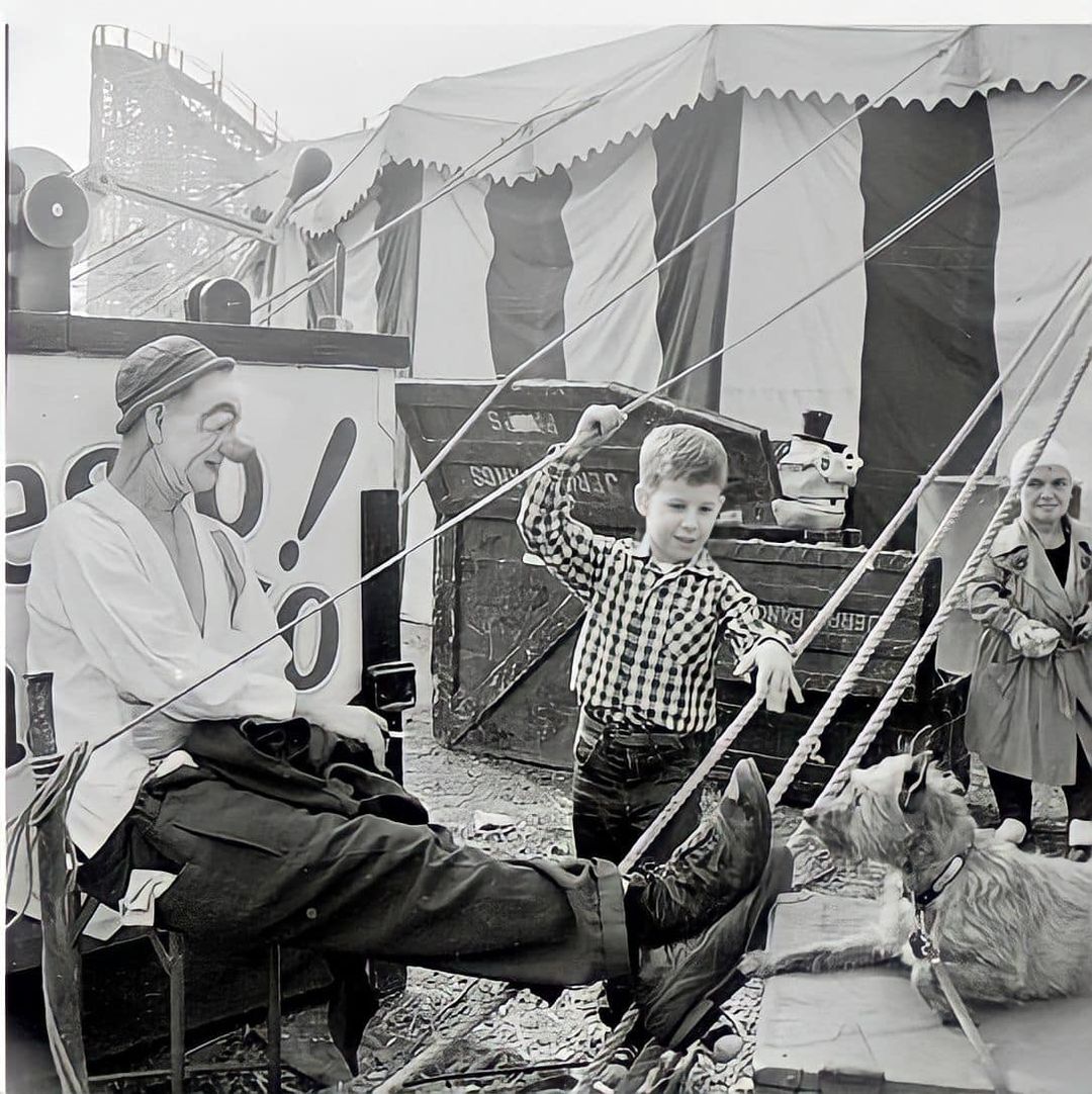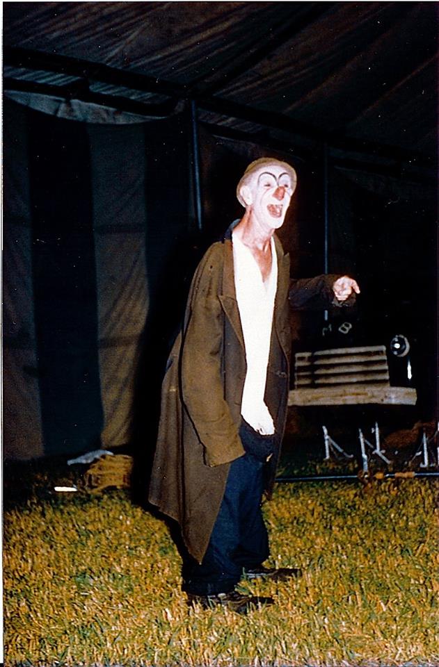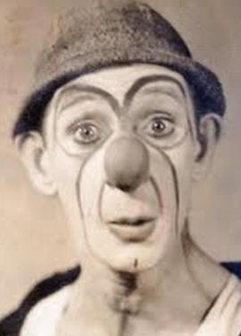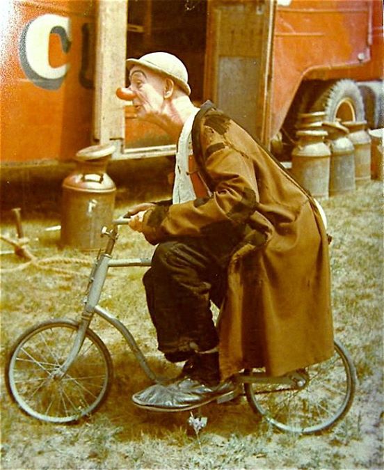 He wore a baggy suit with low cut neckline. He continued the lines of his unique make-up design down his neck to accentuate his long neck. An acrobatic clown, he performed the table rocking routine. One of his trademarks was carrying a long knotted rope which would get tangled on objects causing him to do a pratfall.