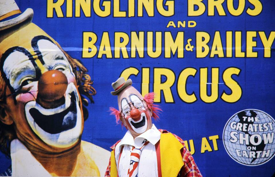 Lou Jacobs in front of Ringling Brothers billboard