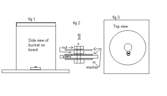 The bucket I use has a hole in the bottom of it with a groove coming from the hole (see fig 1). The board that the bucket sits on a board. The hole goes over a large washer fixed to a bolt and the bolt is fixed to the board. The groove coming from the hole in the bucket slides around the bolt. The washer will not let the bucket come up. When it is time for the child to pick up the bucket slide the bucket to the hole where the washer will fit through the hole.