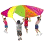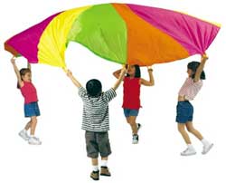 No, not the jump-out-of-a-plane parachute. It’s a colorful toy parachute, about 9 feet in diameter. What do you do with it? Just like in the picture, you space children around the edge, and flip it up, and do dozens of games — run under the parachute & out again before it comes down, start a “ripple” in the chute, use it to bounce a ball up in the air (outside, please!), etc. There are umpteen uses for this, and it comes in very handy at picnics, birthday parties, etc.