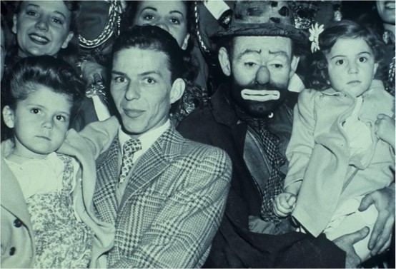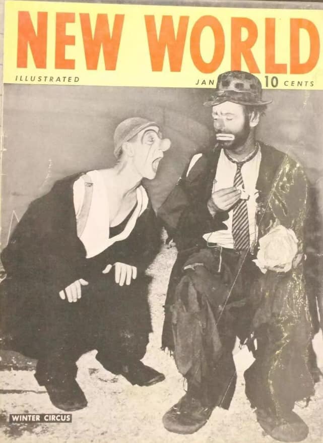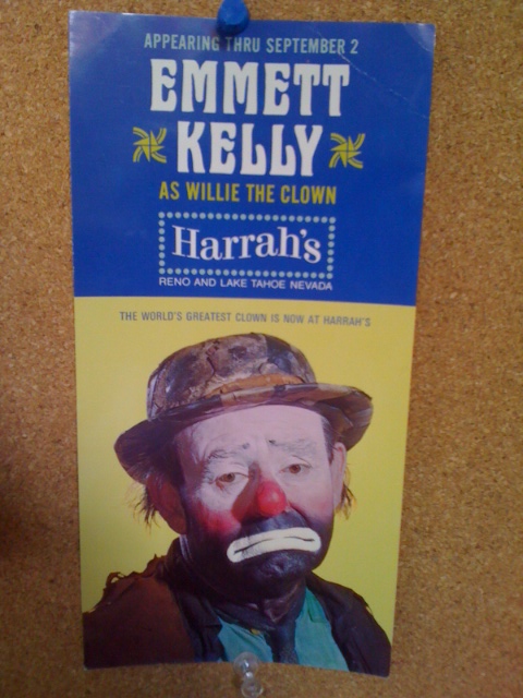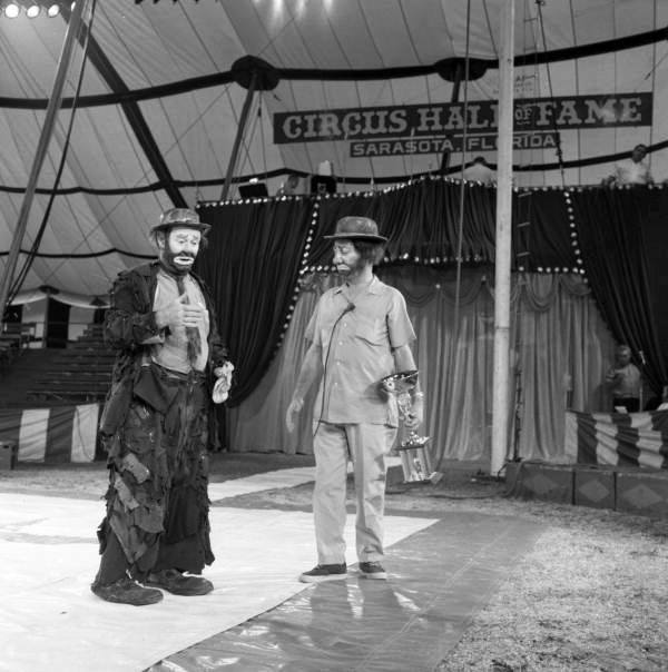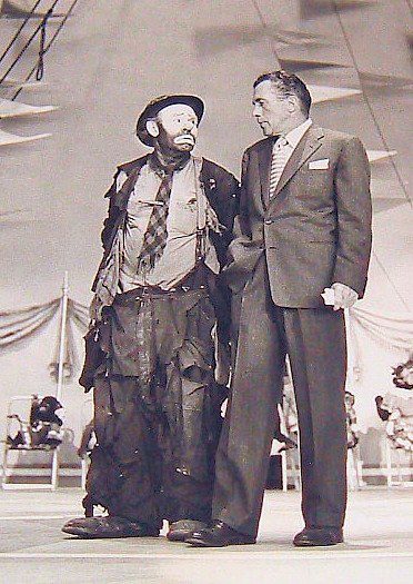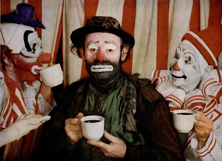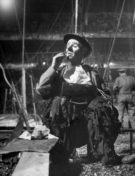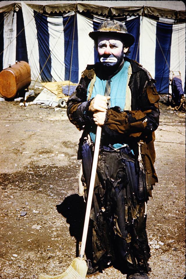 Photo of Emmett Kelly with Ringling Bros. Barnum & Bailey Circus. The photo was taken for an ad for the Pan-American Coffee Bureau, published in Life magazine, April 6 1953, page 49