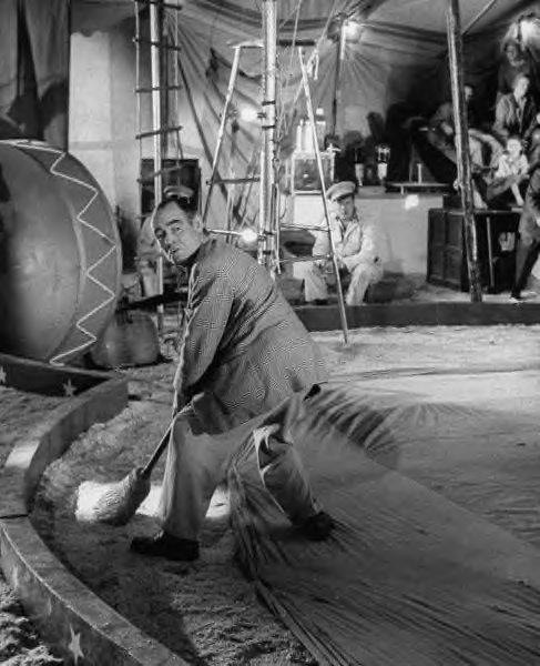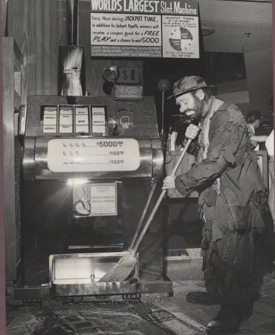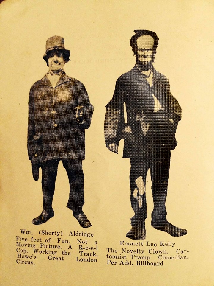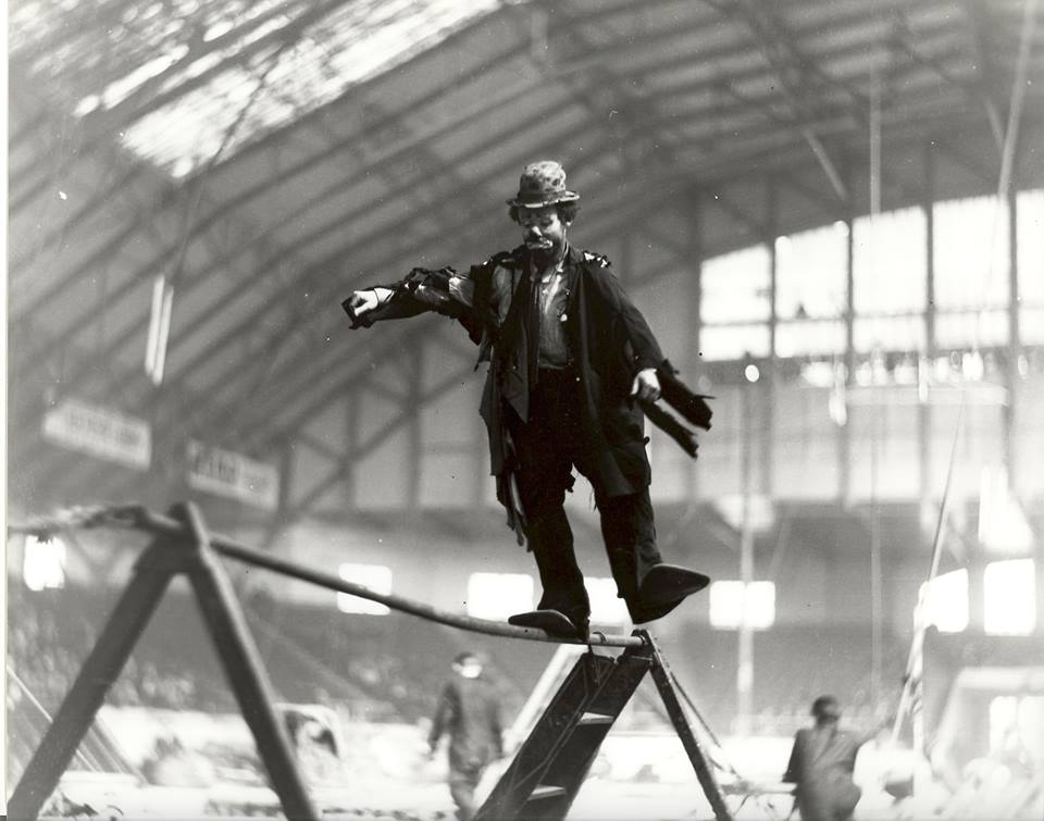 Photo of Emmett Kelly walking the wire as Weary Willy. Thanks to the Circus Historical Society on Facebook – https://www.facebook.com/groups/CircusHistoricalSociety/