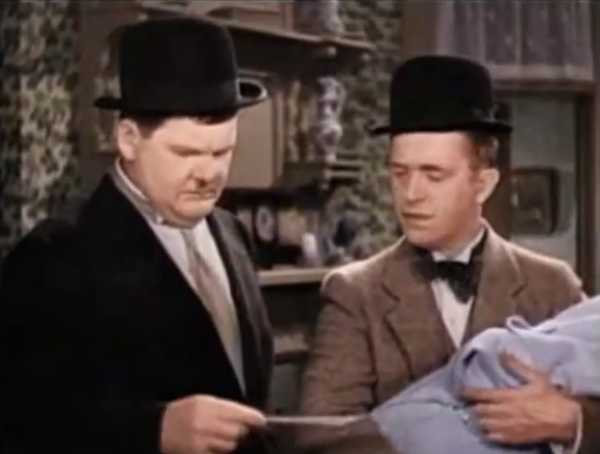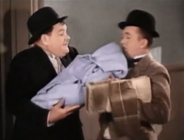 As they say, everything old is new again.  Having no choice, the two try to take care of the now-crying baby, with their efforts to keep quiet hilariously failing.  Eventually, the trio falls asleep, and when the baby starts crying, the sleepy Oliver tries to give him a bottle, only to give it to Stanley instead.