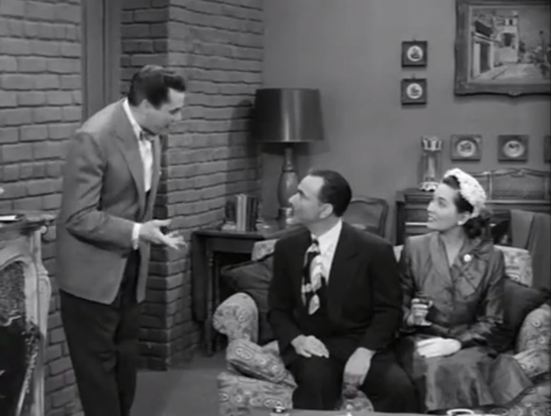 In Cuban Pals, some of Ricky Ricardo’s old friends — professional entertainers — have come to America from Cuba, and visit with Ricky and Lucy.  Lucy, of course, speaks no Spanish, and the Cuban couple speak no English, which makes for some interesting comedy when Ricky leaves the room for a moment.  However, that’s nothing compared to the very funny scene when Ricky begins translating from English to Spanish and back – a very funny episode, including when they ask if Lucy’s hair is naturally red, and Ricky takes some liberties with the translation.