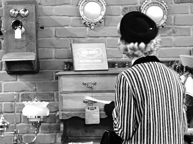 While there, Lucy tries to take a sneak peak at the prices, and is floored when the salesman announces the actual cost – well over her budget. Since Lucy wants to keep up appearances, she goes along and spends …. over 3,000 dollars! She calls Fred (William Frawley) and Ethel Mertz (Vivian Vance) for help, and tightwad Fred faints at the thought of spending $3,000 on furniture!