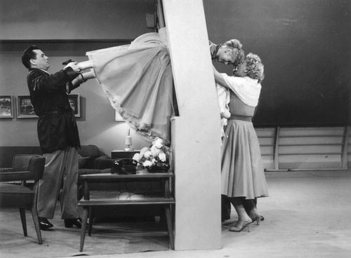 Ricky serenades Lucy … and the camera pulls back, showing the audience that she’s still stuck in the porthole, with workers on the inside of the room trying to get her out … with an acetylene torch!