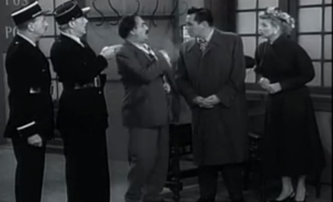 So Lucy speaks English to Ricky, who translates it to Spanish to the inebriated man, who translates it to German to the police officer, who translates it into French for the police captain – and the words go back and forth up and down the line, ending with Lucy paying her bill without counterfeit money, just in time for the Mertzes to come in, having been arrested for passing counterfeit bills!