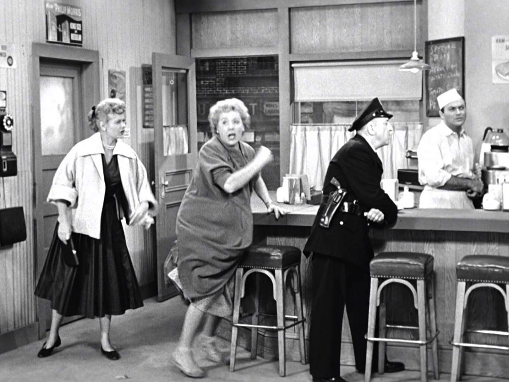 Lucy and Ethel try to get change in a diner in Ricky and Fred are TV Fans