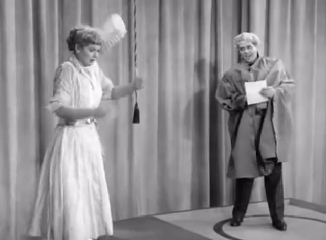 In order to win the prize, Lucy simply has to stand within a circle on the stage, while Ricky is given a list of items — and has to sing a line from a song with one item from the list. This leads to a very funny bit of slapstick comedy, as the different things that he sings falls on Lucy, including: