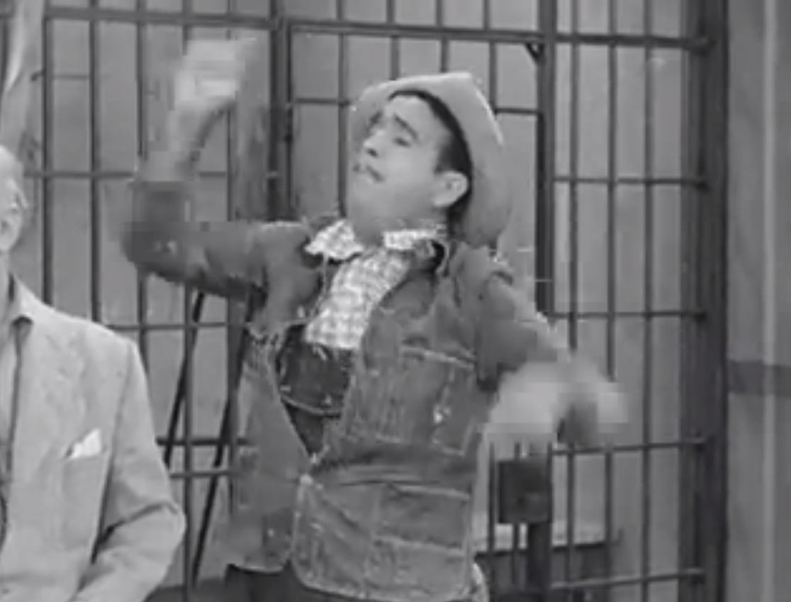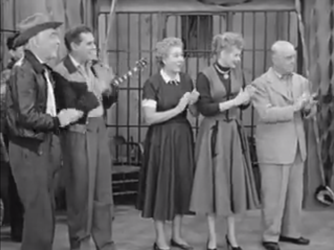 One thing leads to another, and the sheriff arrests Lucy, and holds her in jail. The rest of the gang ‘serenade’ the sheriff in the jail, covering the noise of the files that Ricky, Fred and Lucy are using on the bars of the cell. No sooner do they finish then the Sheriff comes in, sorry for overreacting before and opening the cell door to let Lucy out. However, the section that Lucy is holding on to stays in place as the rest of the door swings open, a classic visual joke.