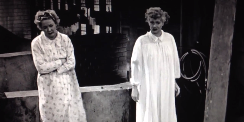 Lucy Ricardo (Lucille Ball): I know — one of us could jump down onto the sidewalk below, and when a crowd gathers, she could tell them that I’m up here.