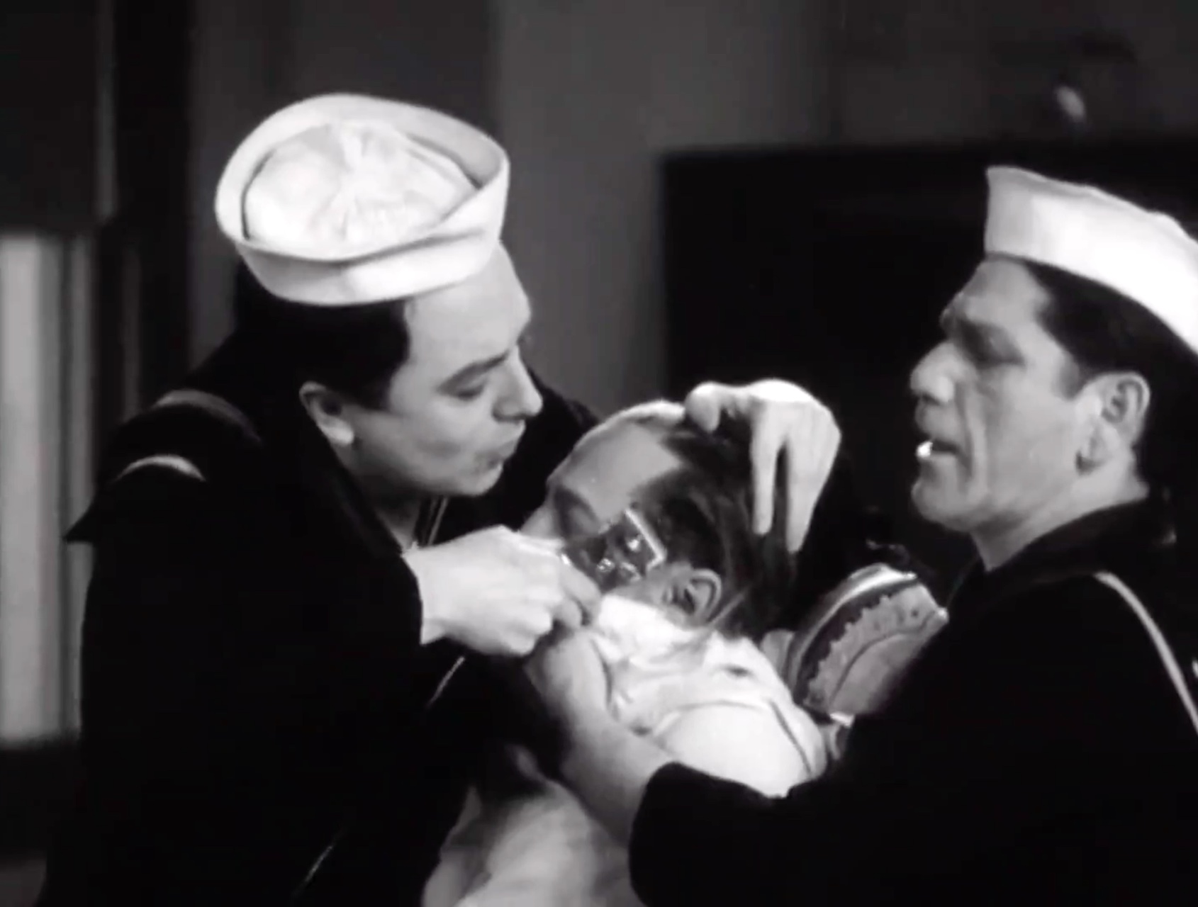 Jack and Shemp don’t want to enlist, so they try to get out of it by pretending to be near-sighted and deaf. Which almost works, but the Chief Petty Officer (CPO) happens to be there … The doctor’s ready to dismiss them both, when the CPO throws a silver dollar on the floor. They both hear it, see, where it landed, and jump for it! They’r in the Navy now …