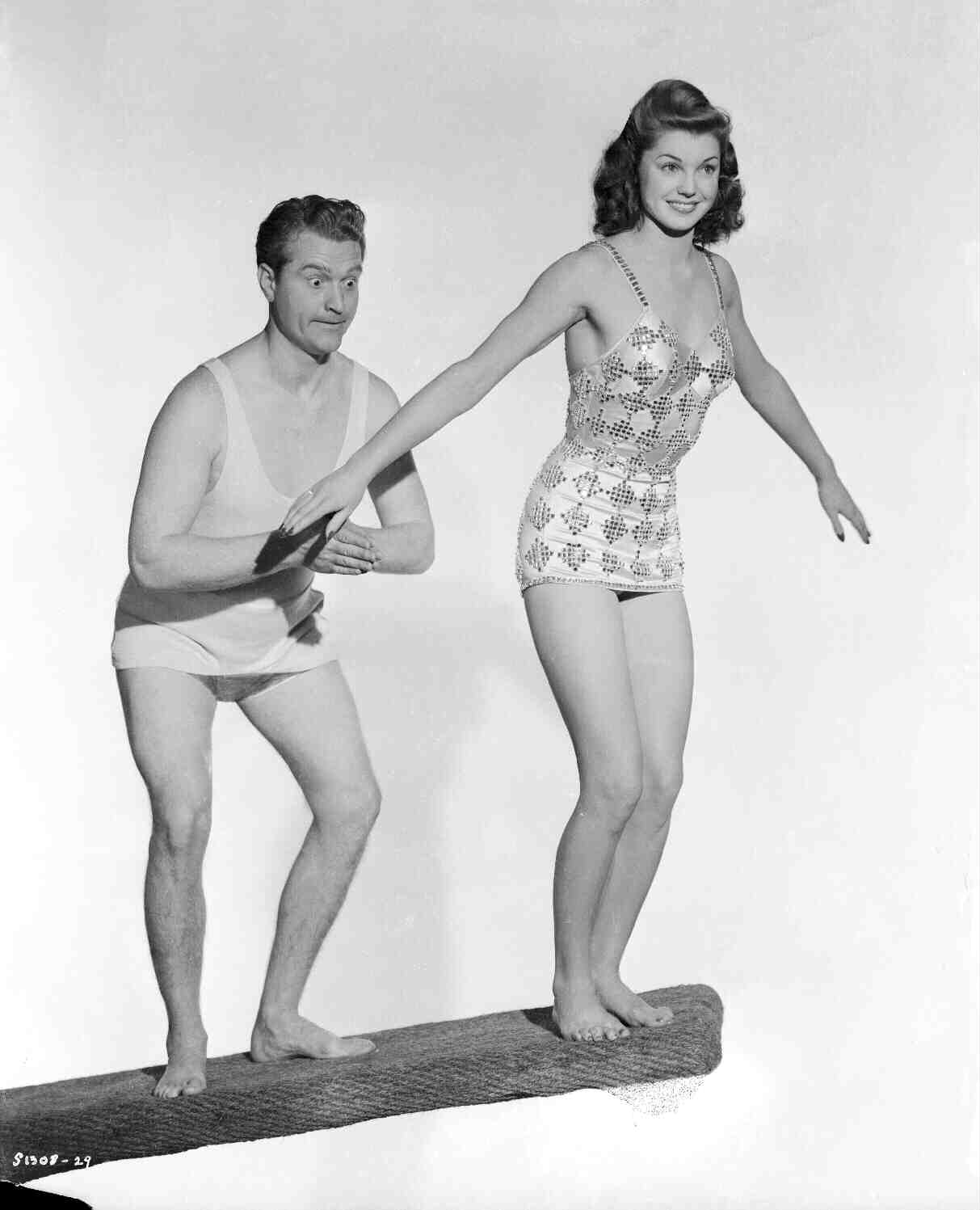 The college is loaded with pretty MGM starlets. Cugie shakes up more hot South American rhythms. A fine cast, including Basil Rathbone, Donald Meek, Janis Paige, and Groucho Marx‘s favorite foil, Margaret Dumont, gives expert support. The finale is a wowser of a water ballet featuring the movies’ favoring bathing beauty swimming gracefully along alternating jets of water and flame. But Esther isn’t the only artistic lovely. Red dons a pink tutu for a college ballet class and reduces Tchaikovsky to chopped liver. Dive in!