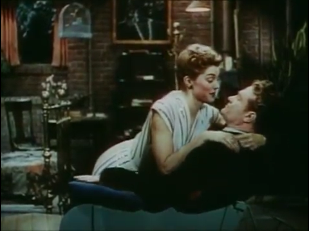 Red plays the part of Steve Elliot, a songwriter who has fallen in love with Caroline Brooks (played by the lovely Esther Williams), a swimming instructor at an all-girls college. Steve intends to forgo writing popular music numbers, and devote himself to writing serious music. Which displeases his friend, George Adams (played by Basil Rathbone) enough that George intends to break up the marriage before it starts. With the help of a Latin actress, George succeeds, thinking that Steve will now throw himself into his work. Instead, however, he pursues Caroline, trying to prove his fidelity. In the course of this, Steve enrolls in the all-girls college, giving Red Skelton plenty of time to do his comedy, and he has quite a few excellent moments, including:
