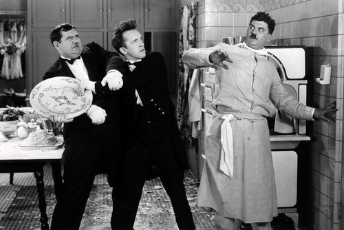 Oliver Hardy and Stan Laurel attacking Billy Gilbert