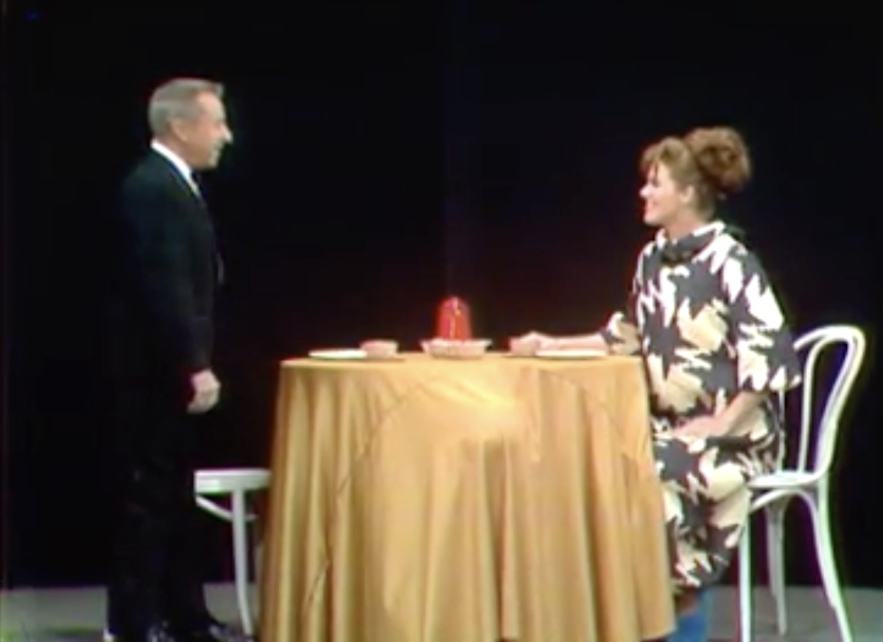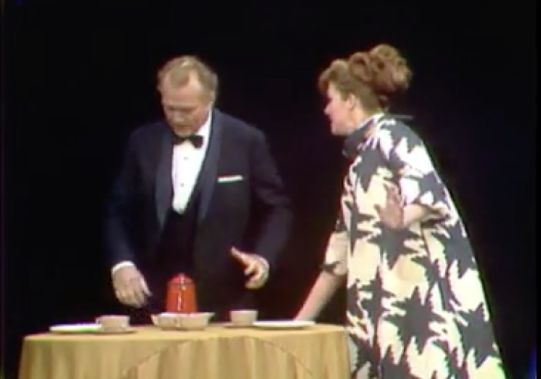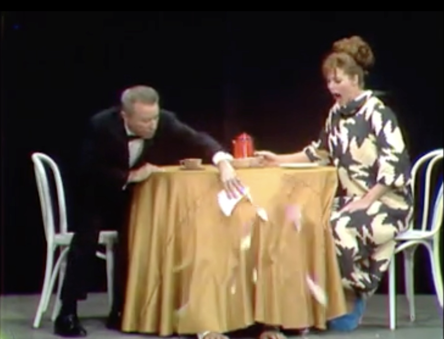 In the original sketch, Red Skelton was hiding under the table, with his hands intentionally sticking out, so the husband (George Gobel) would realize someone was hiding underneath. Think of some ‘clownish’ things the husband could do!