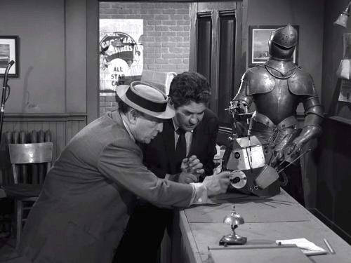 Stranded in the future, with the time helmet broken, he makes the acquaintance of a scientist (Stanley Adams). He believes his strange tale and takes his to a fix-it shop. Where a handyman, played by comedy veteran Jesse White, attempts to fix it. The scientist, however, plans to hijack the time helmet for himself, and escape to the idyllic 1890’s himself. All turns out well, however, as Woodrow jumps ‘on board’, and the two are back in the 1890’s.